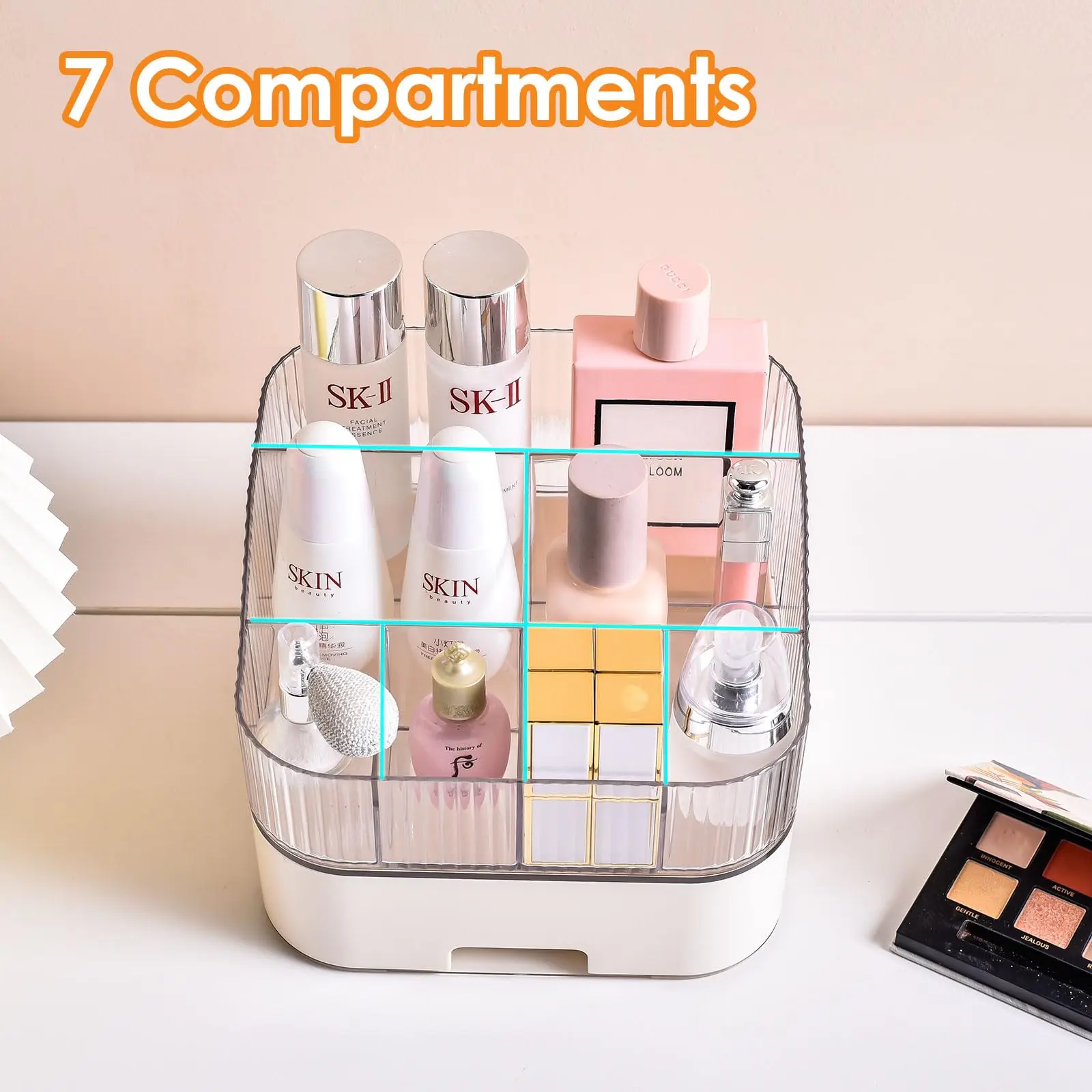 7 Compartments: Daily beauty essentials can be neatly arranged, from perfumes to lipsticks, lotions to facial creams; The array of slots keep even smaller items organized and easy to grab