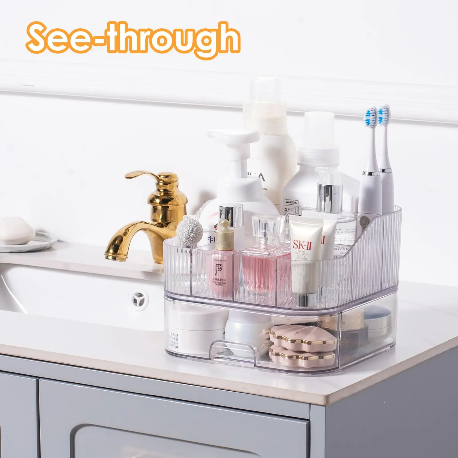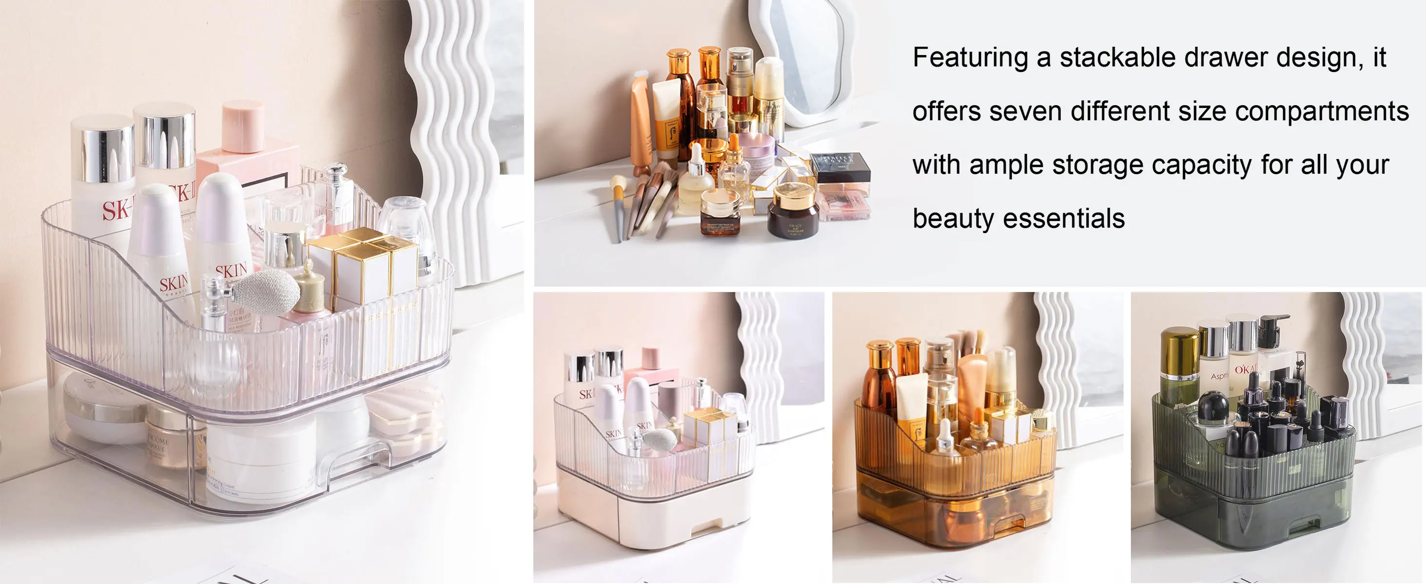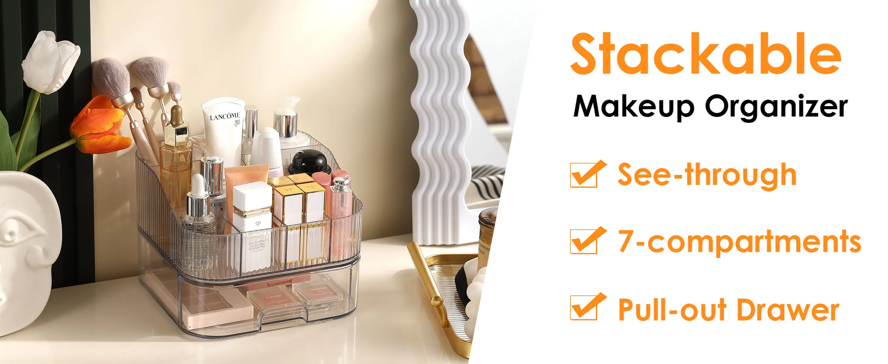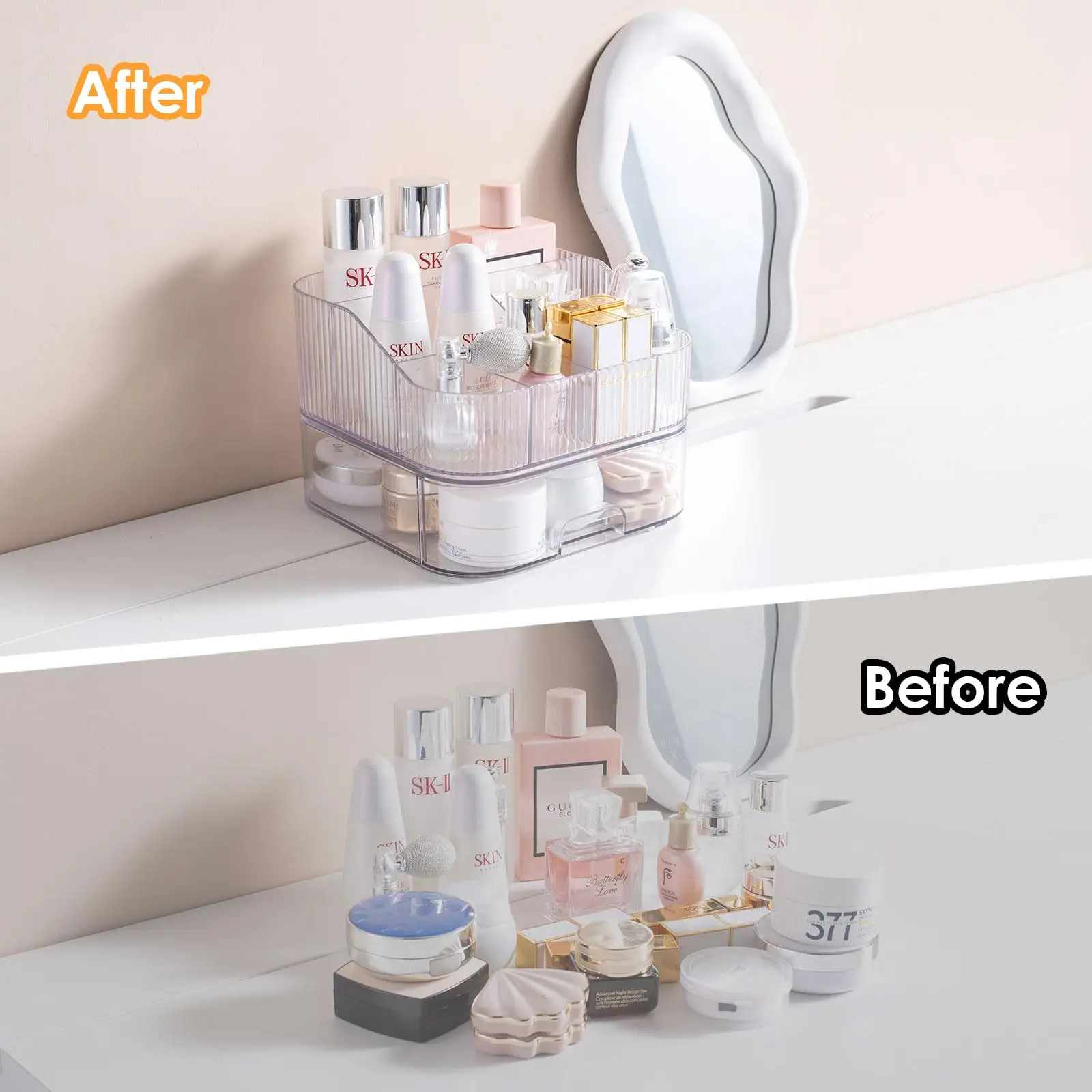 Stackable: Makeup organizer countertop has one top organizer and one bottom drawer which can be stacked or used individually